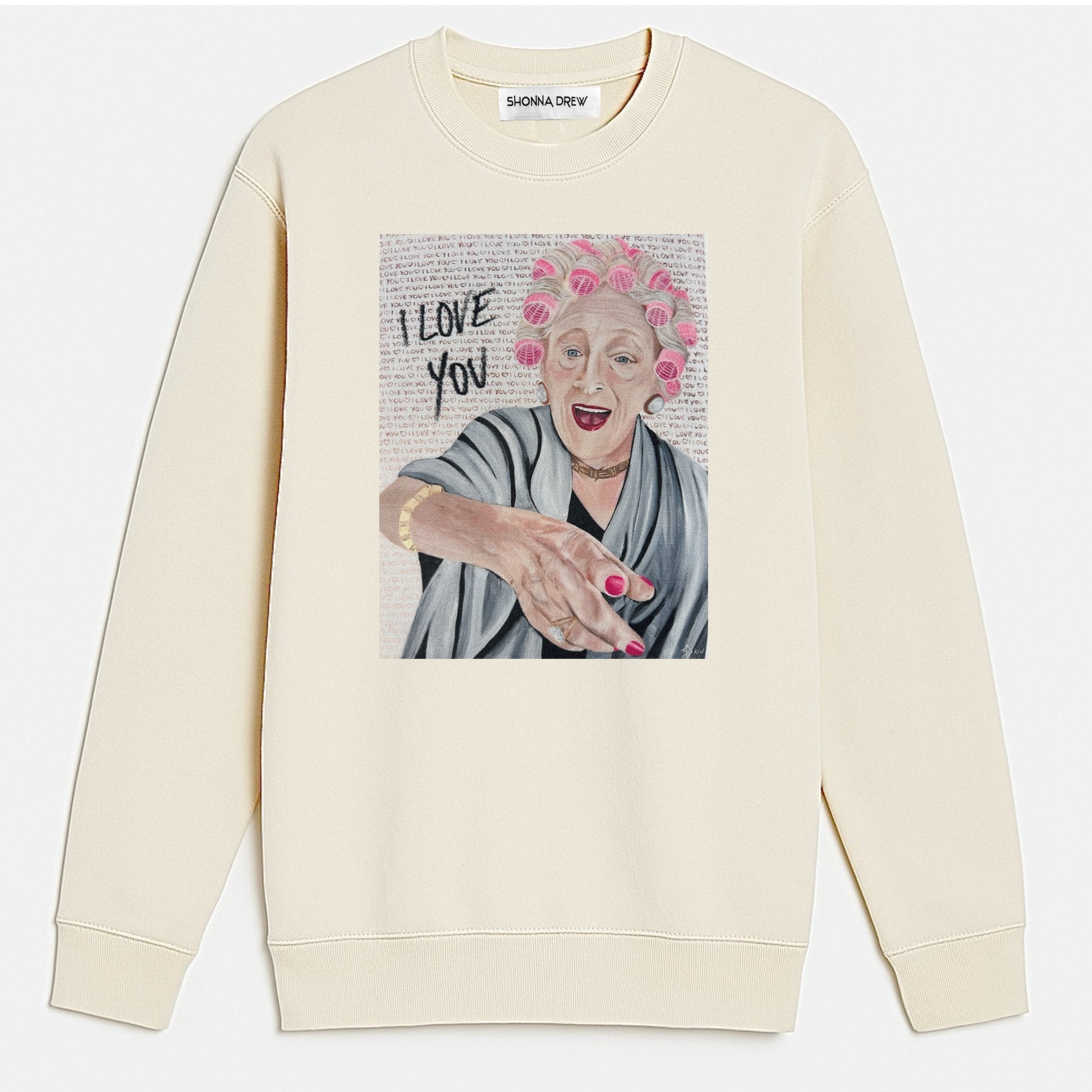 The “I Love You” Sweatshirt is a tribute to the incredible magic of my grandma Essie. She survived the Holocaust, but more than that... she lived life with so much love, laughter, and strength. I painted this piece to try and capture her essence. Despite all she endured, she always led with love, radiating happiness and kindness. She made sure everyone around her felt so deeply loved, and this design honors the very essence of Essie.