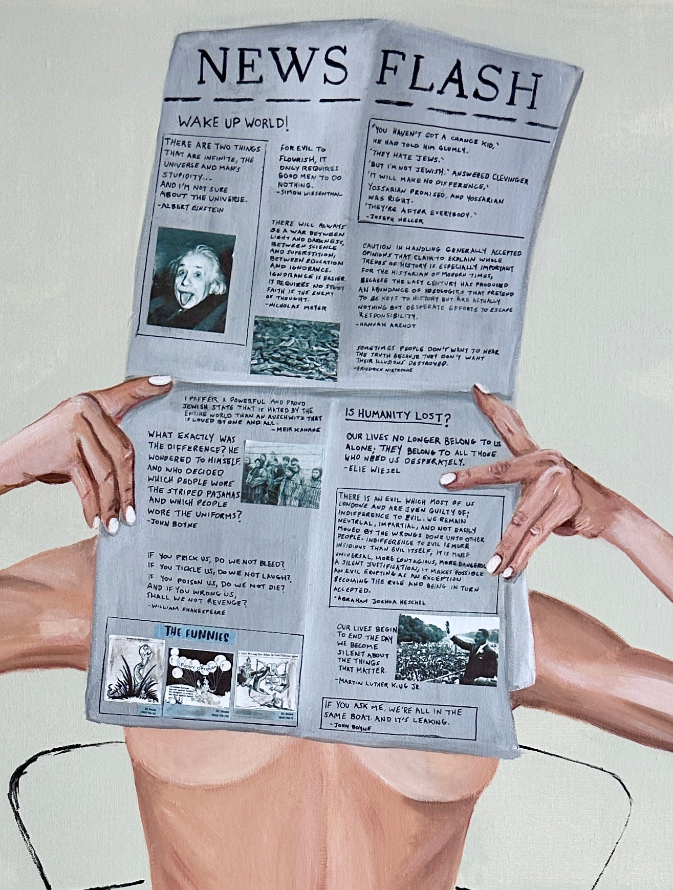 The newspaper in News Flash is filled with words about antisemitism, injustice, and the high cost of silence. Every passage speaks to a different shade of indifference… the ones who look away, the ones who say nothing, and the systems that quietly let hate grow louder.